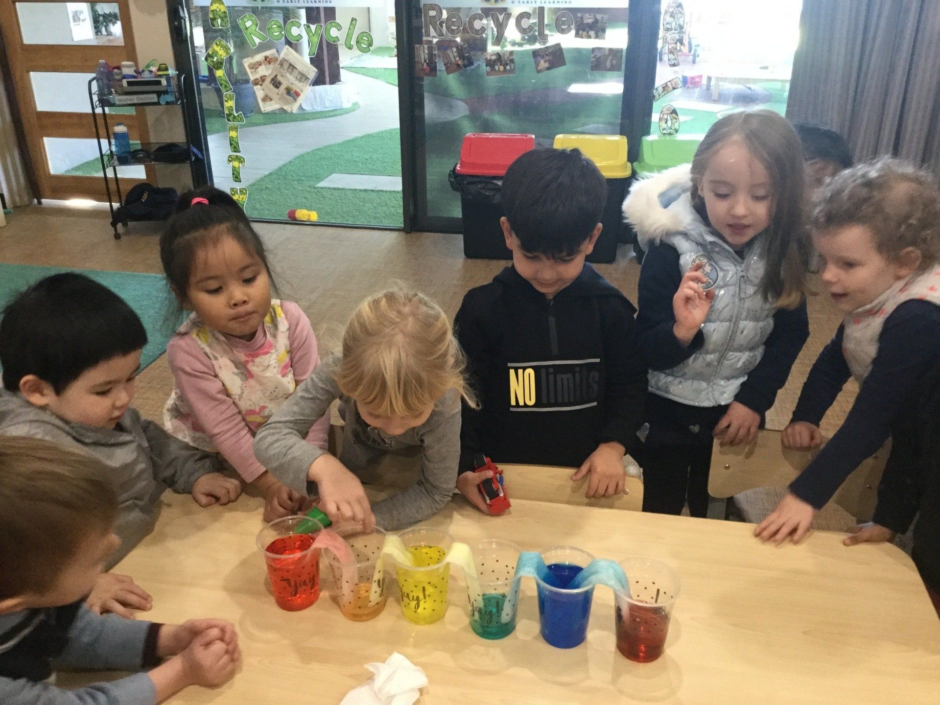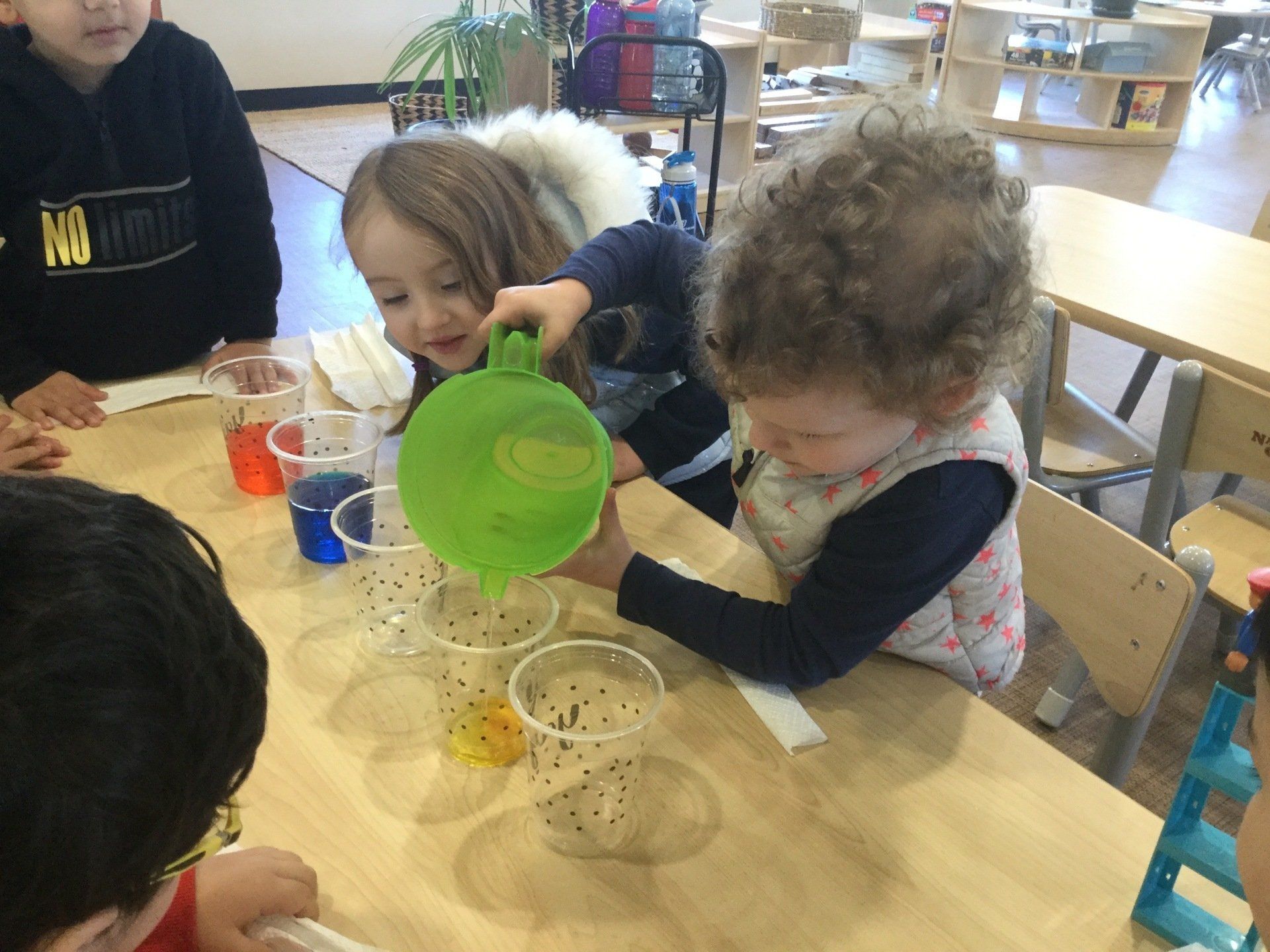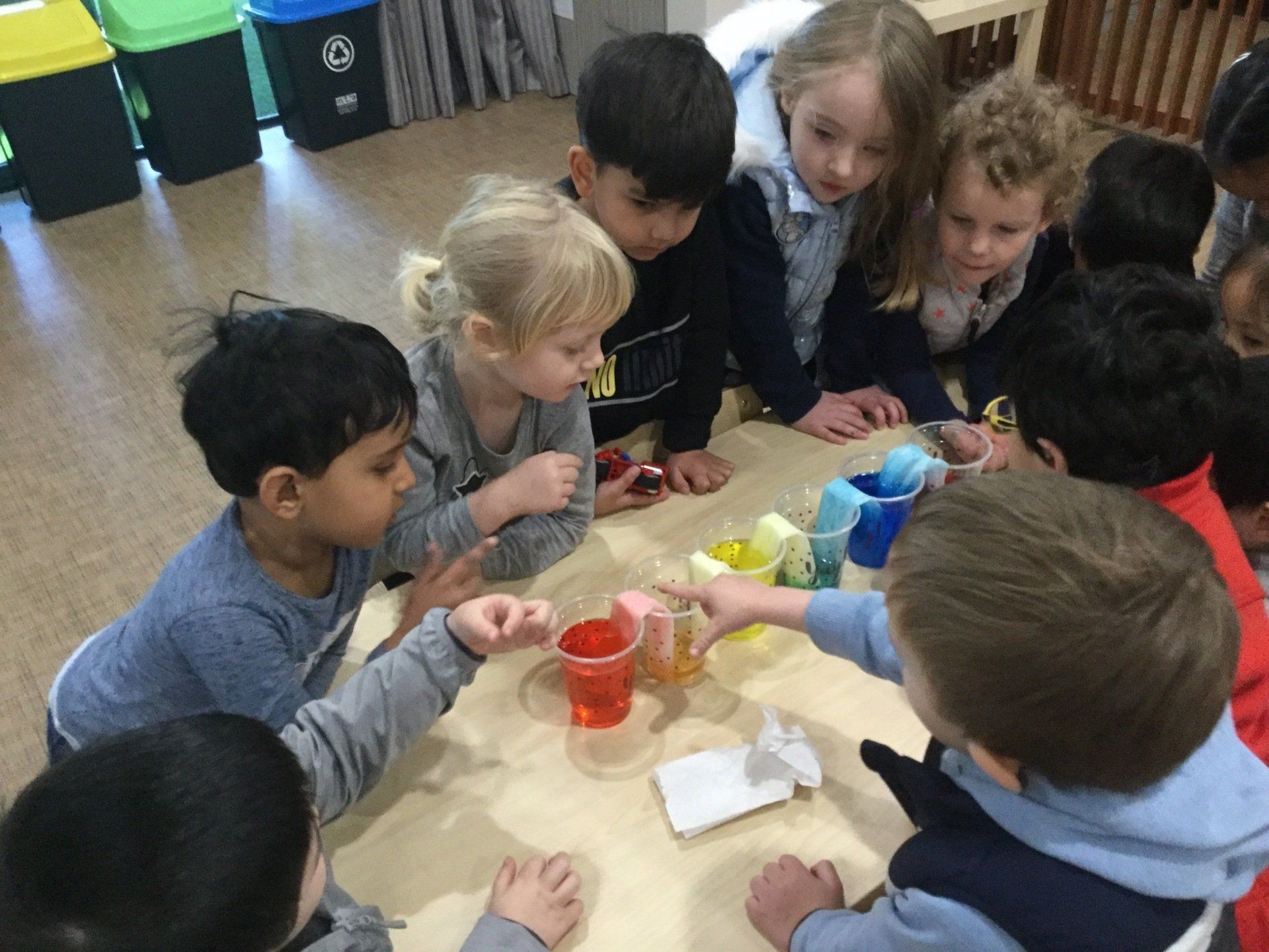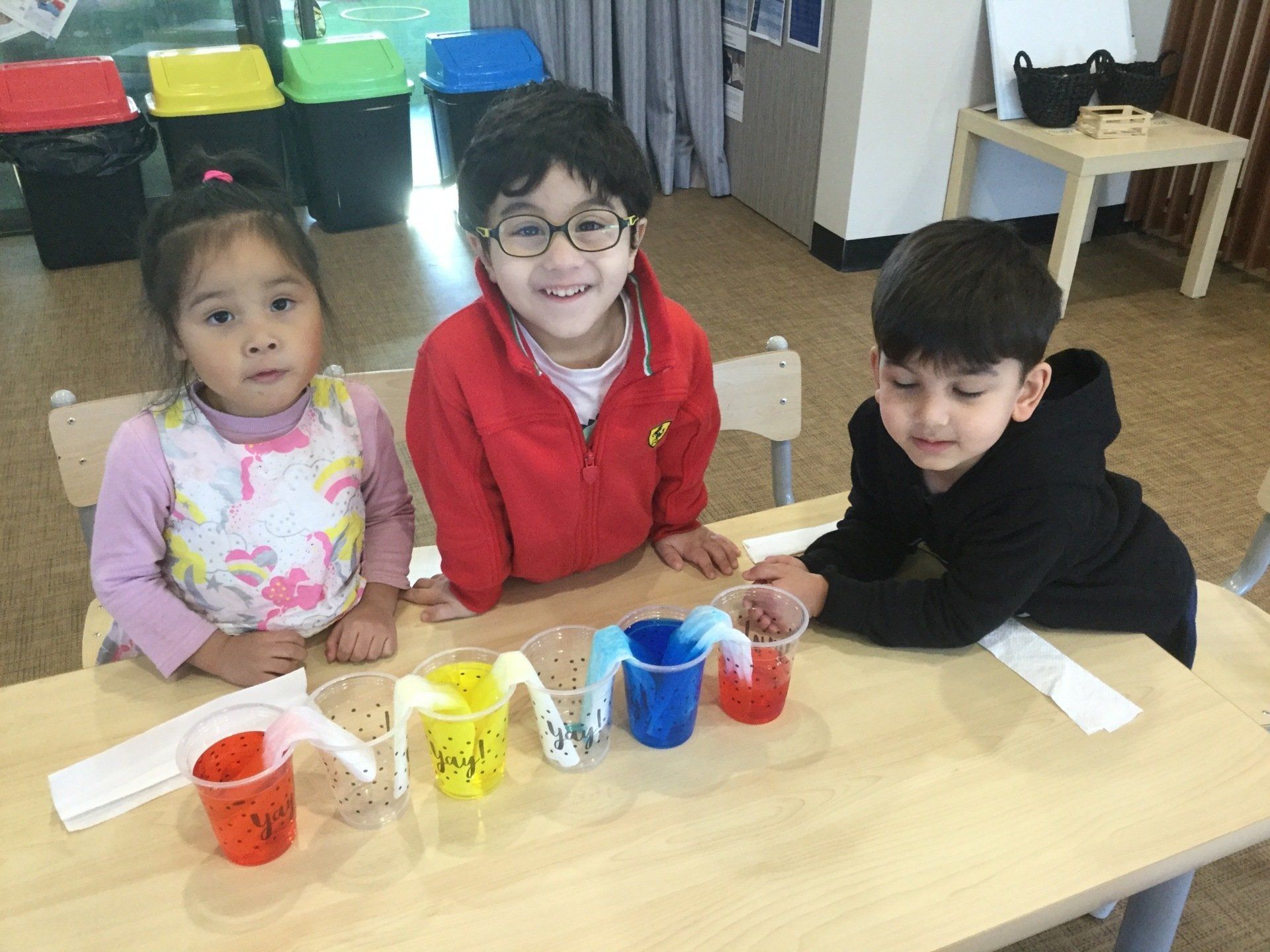 This week the Young Einsteins participated in a walking water experiment as a continuation of learning about Rainbows. Children had the opportunity to pour the water, fold the paper towels and put them in between cups and observed how the rainbow water travel through paper towels. We used red, yellow and blue to create six colours of the rainbow.