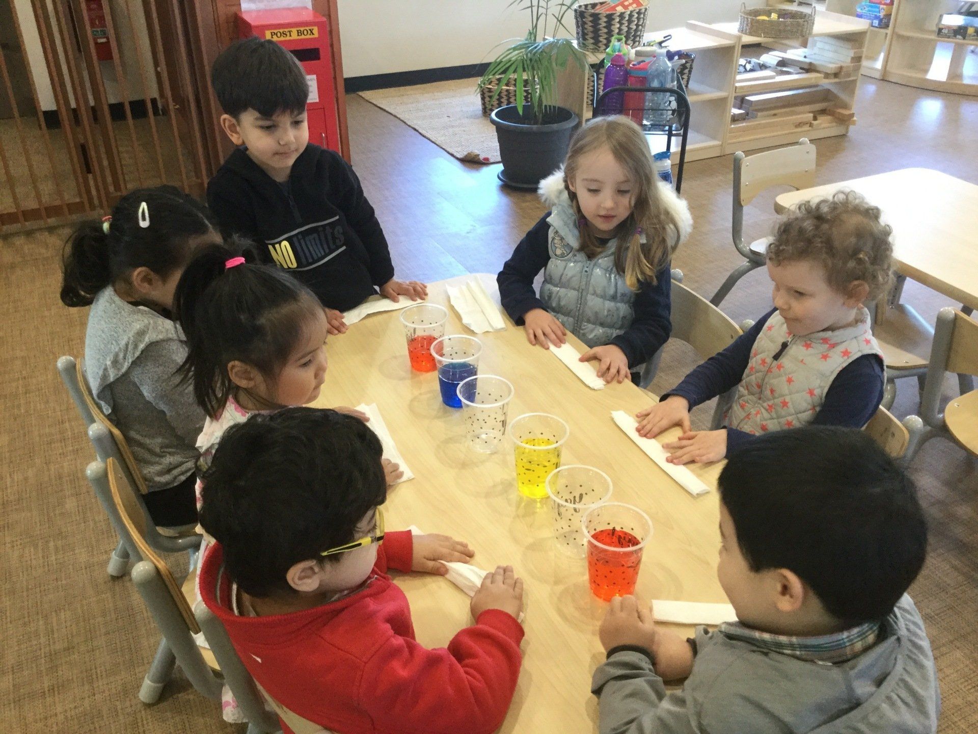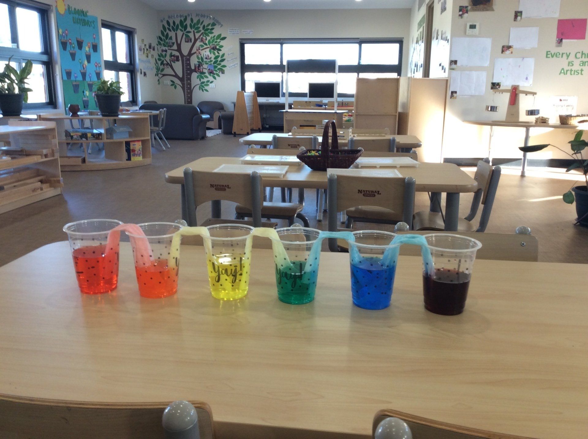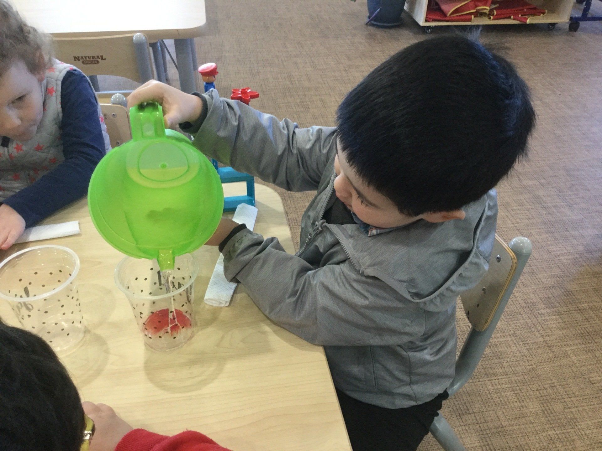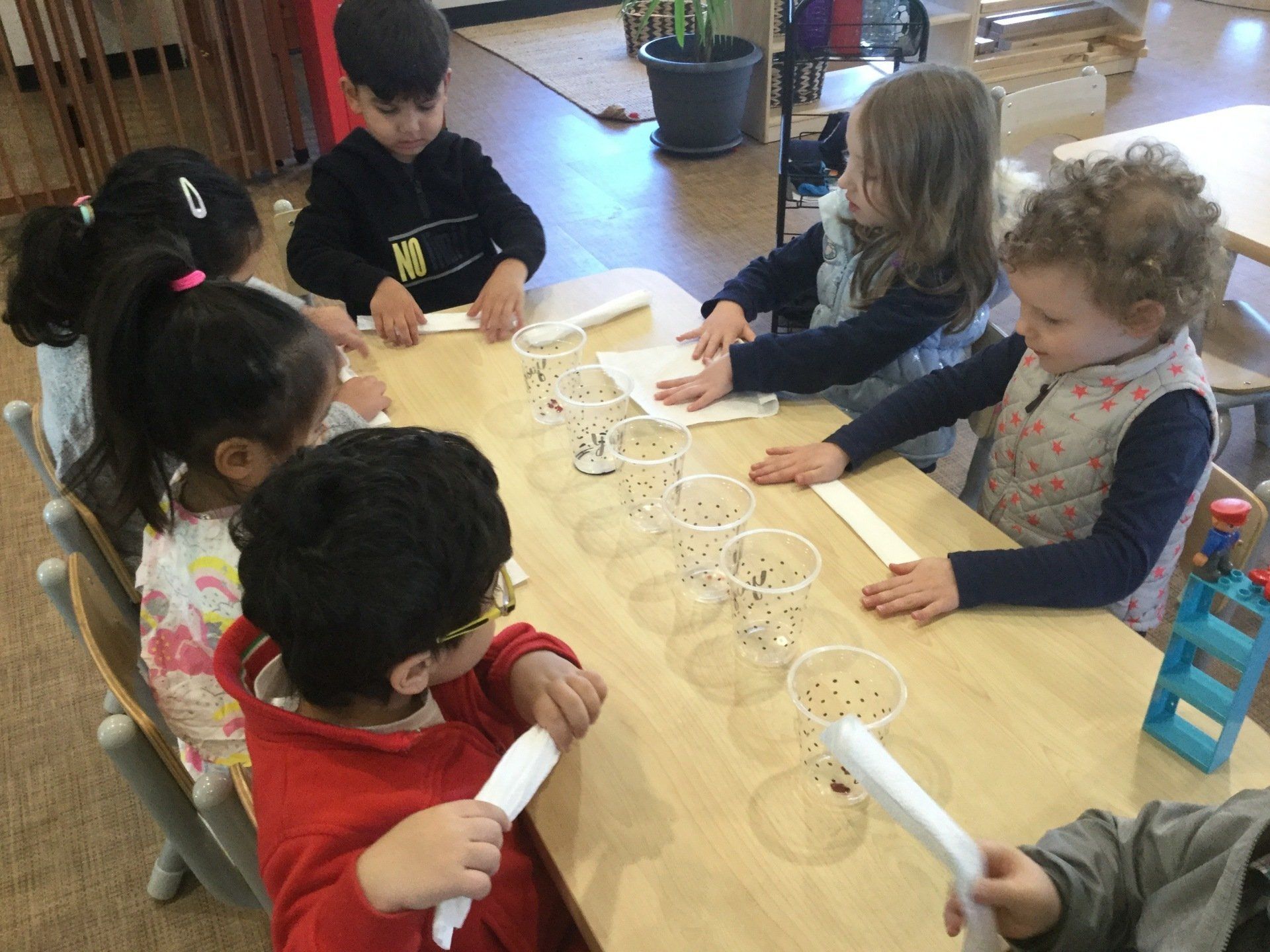 This week the Young Einsteins participated in a walking water experiment as a continuation of learning about Rainbows. Children had the opportunity to pour the water, fold the paper towels and put them in between cups and observed how the rainbow water travel through paper towels. We used red, yellow and blue to create six colours of the rainbow.