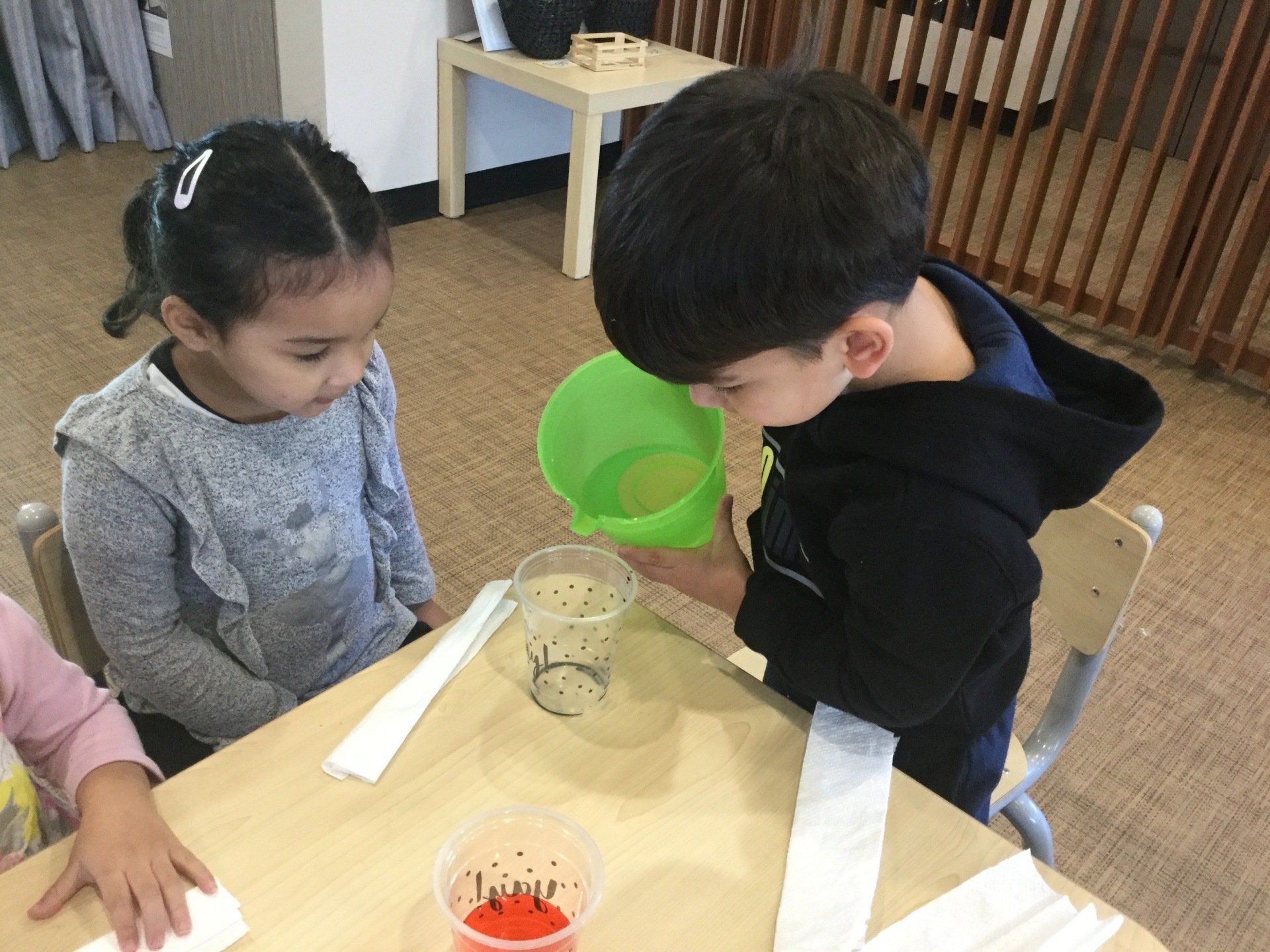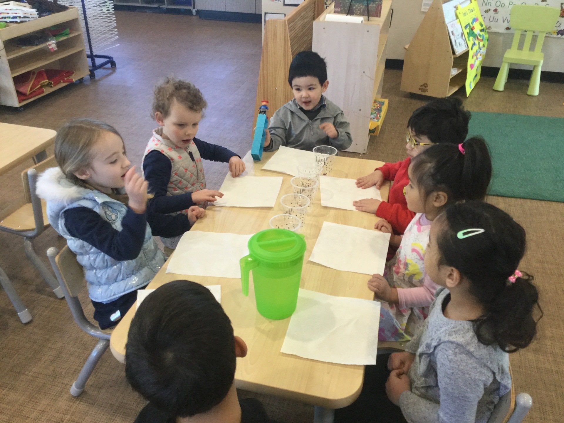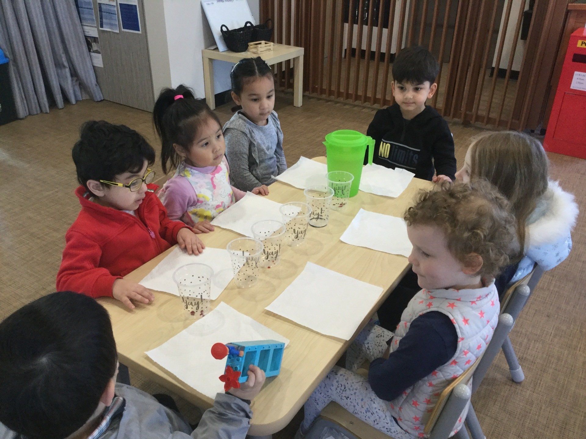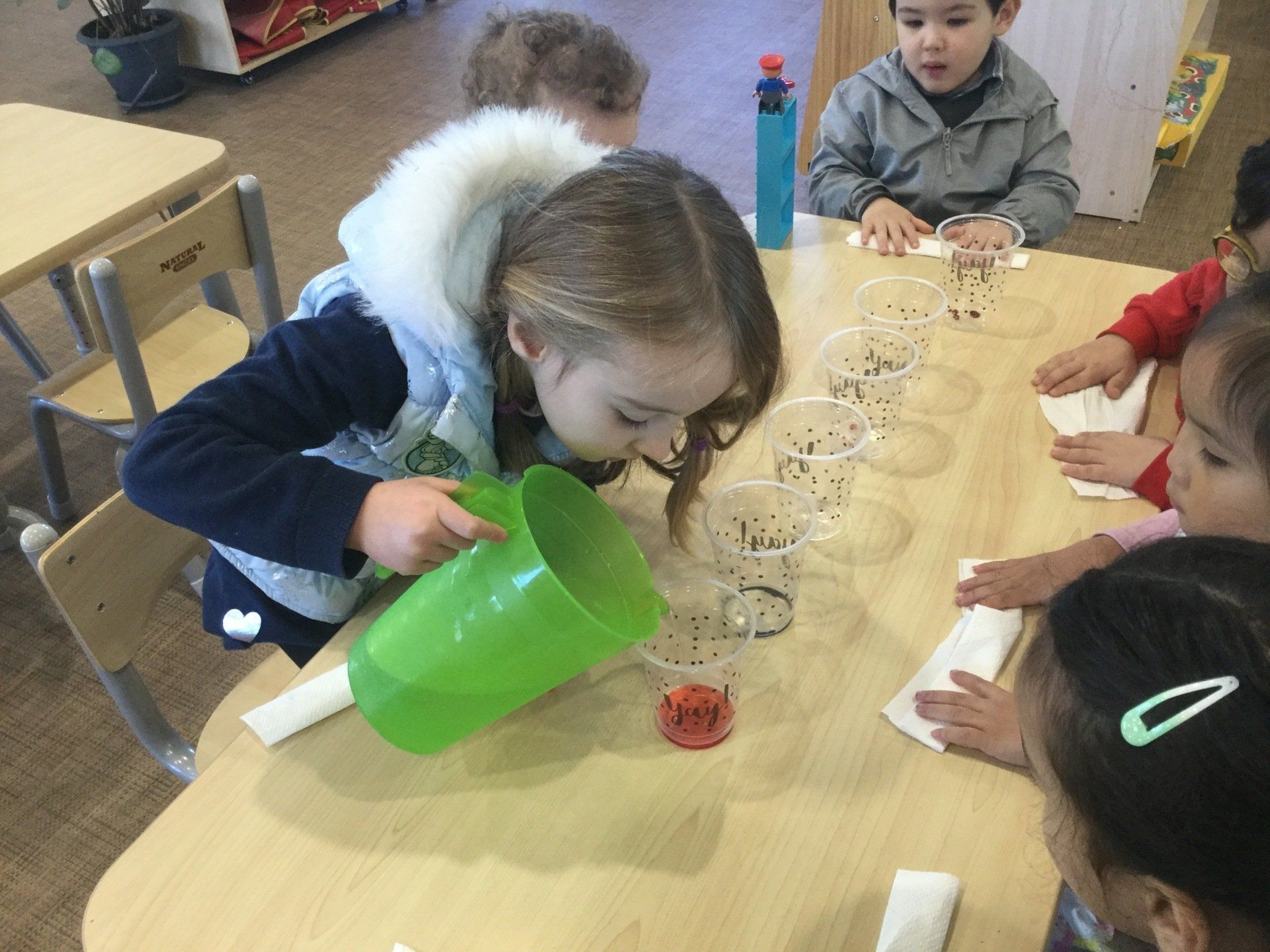 This week the Young Einsteins participated in a walking water experiment as a continuation of learning about Rainbows. Children had the opportunity to pour the water, fold the paper towels and put them in between cups and observed how the rainbow water travel through paper towels. We used red, yellow and blue to create six colours of the rainbow.