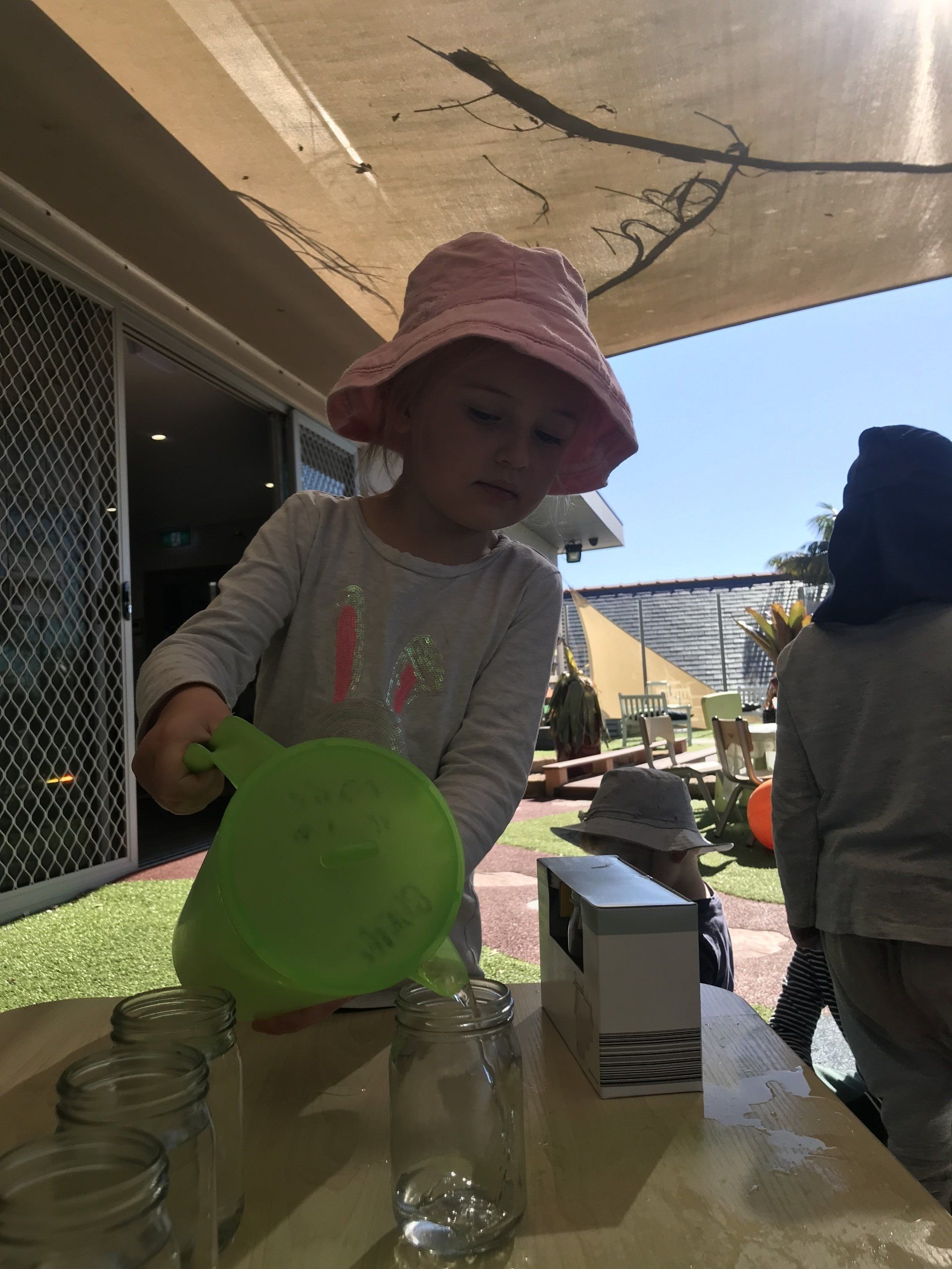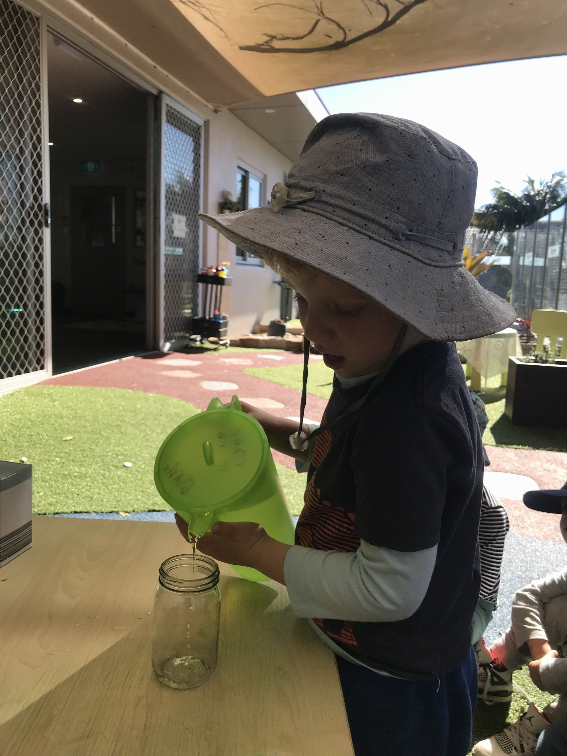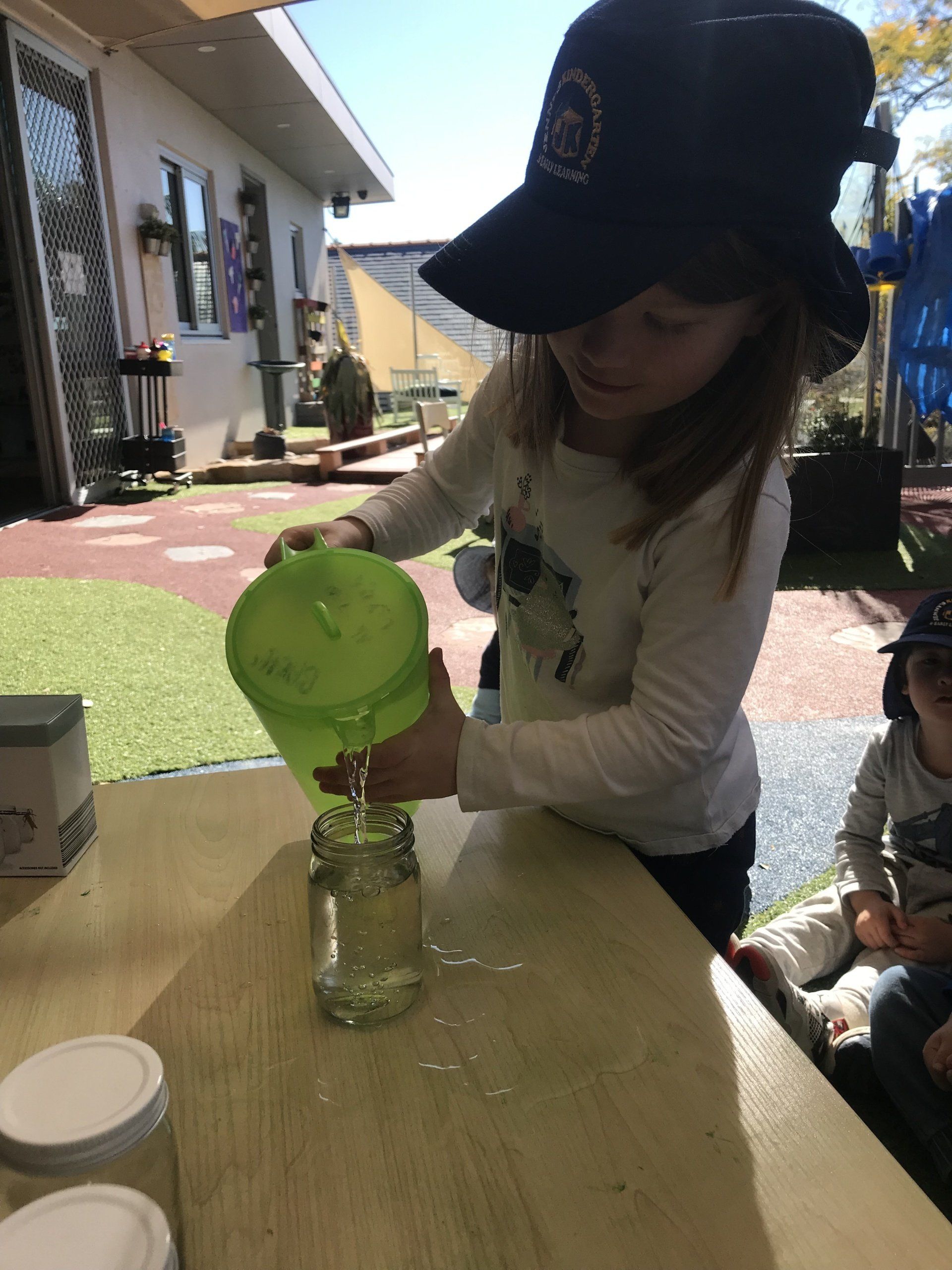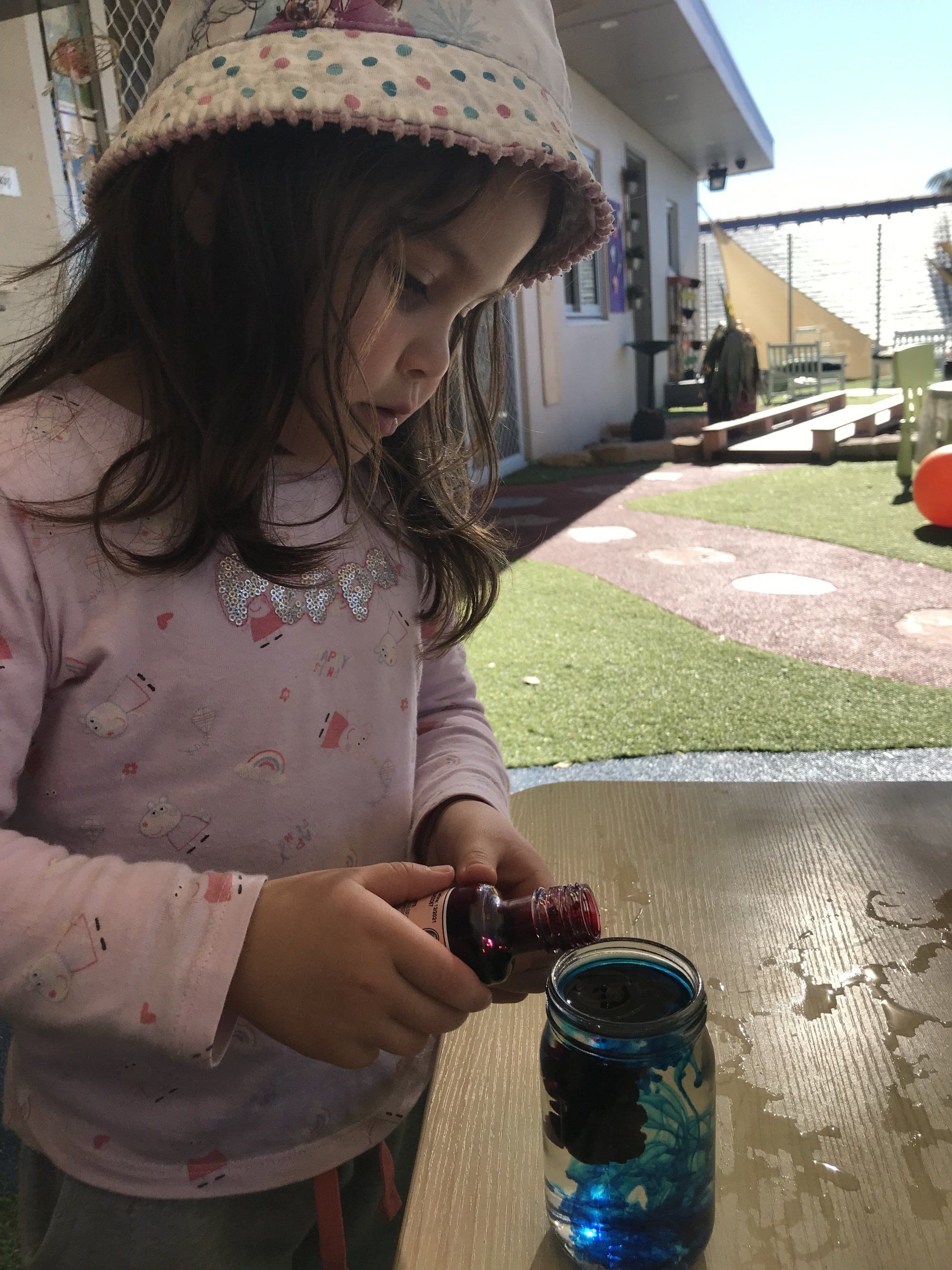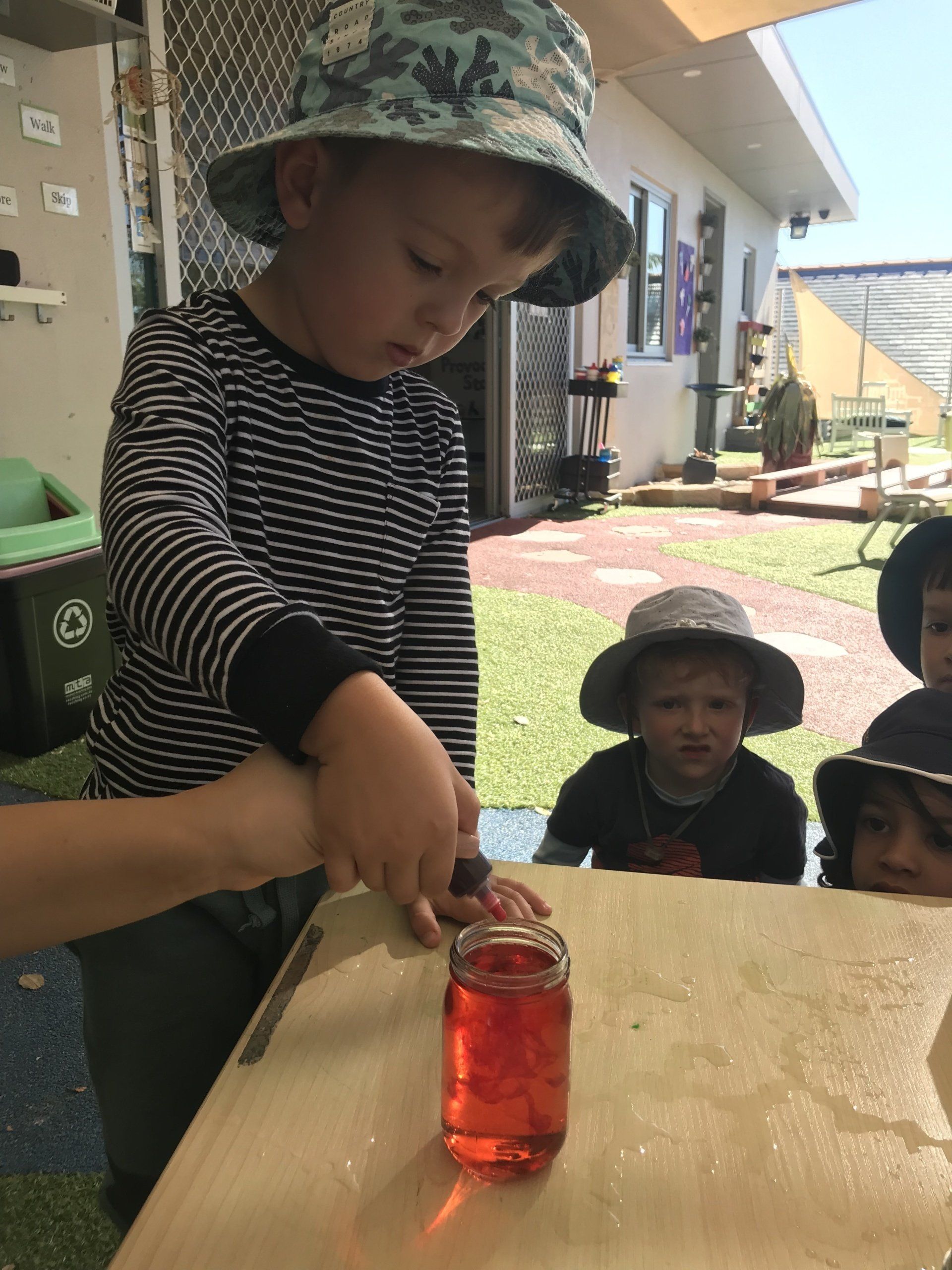 Today Pre Kindy channelled their inner scientists as the children participated in a colour experiment. As part of our STEM Education element of Jenny’s Specialised Early Learning Curriculum this week the children have been learning about their colours and to further extend on this, Pre Kindy explored each Primary colour and discussed how using these colours can make a rainbow! The children demonstrated self-help and hand eye coordination skills as they poured water into a glass jar followed by adding in different coloured food dye. Once all colours were added into the glass jars the children were able to independently identify and verbalise all the colours of a rainbow!