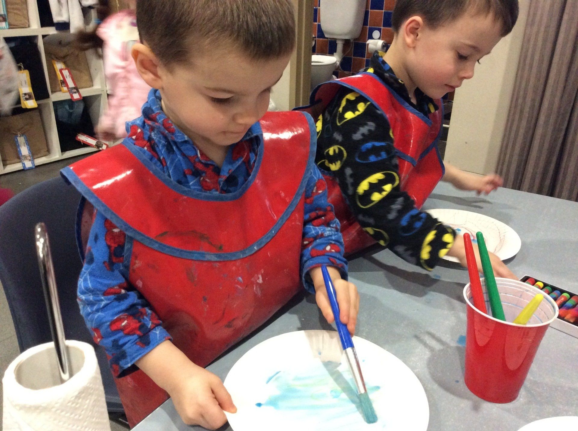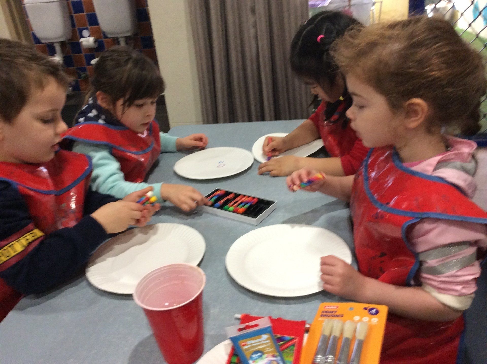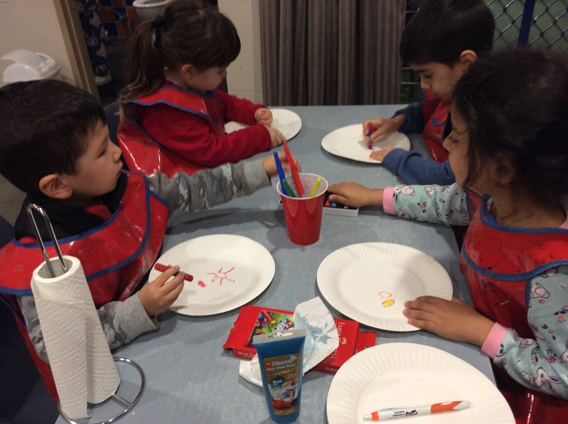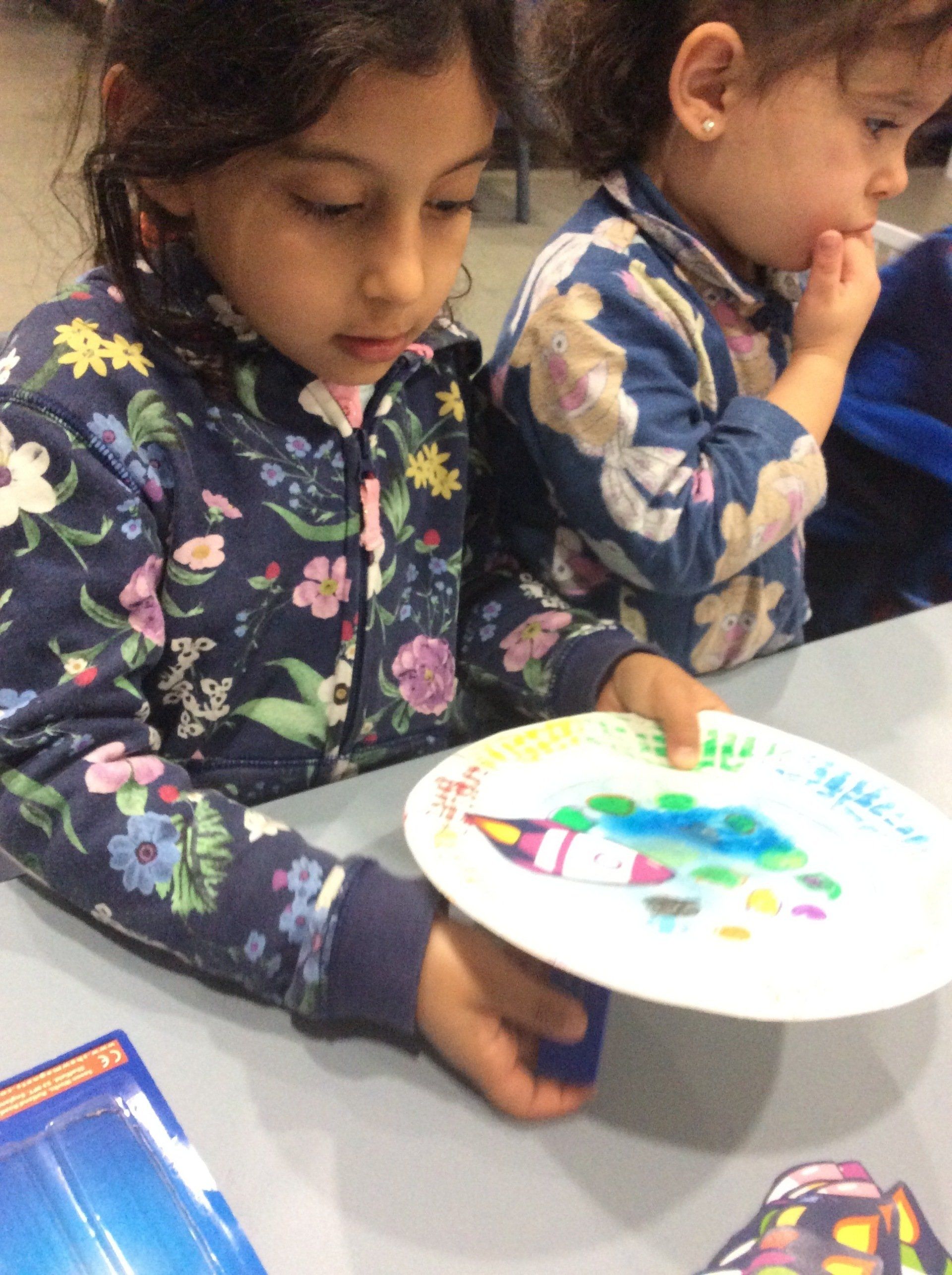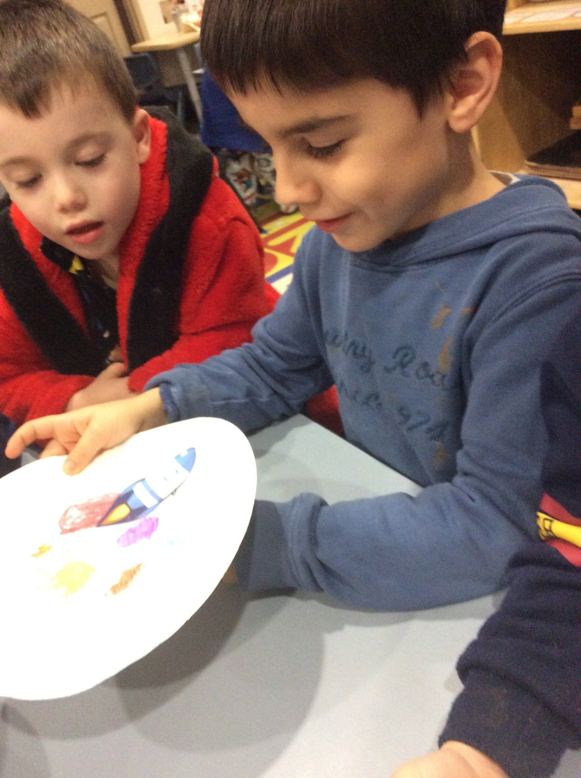 Today we explored making Magnetic Rockets. The children started by drawing some planets on a paper plate with oil pastels and then we painted over these with watercolour paints.