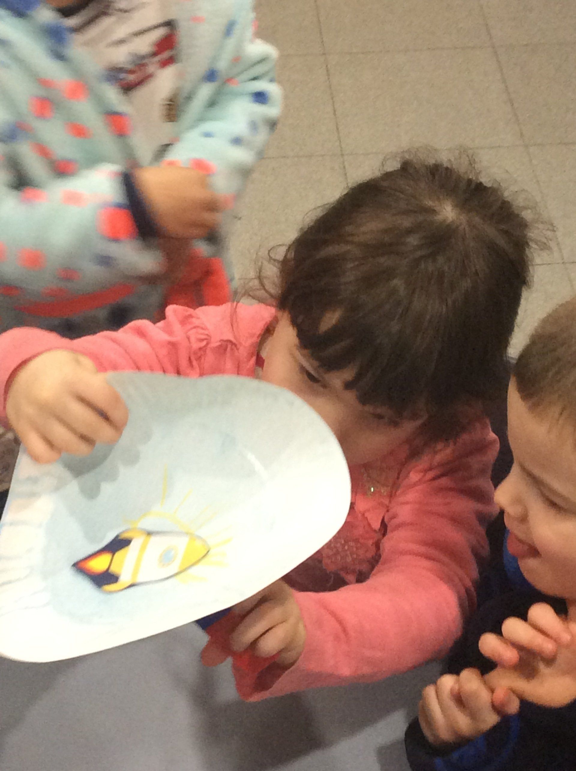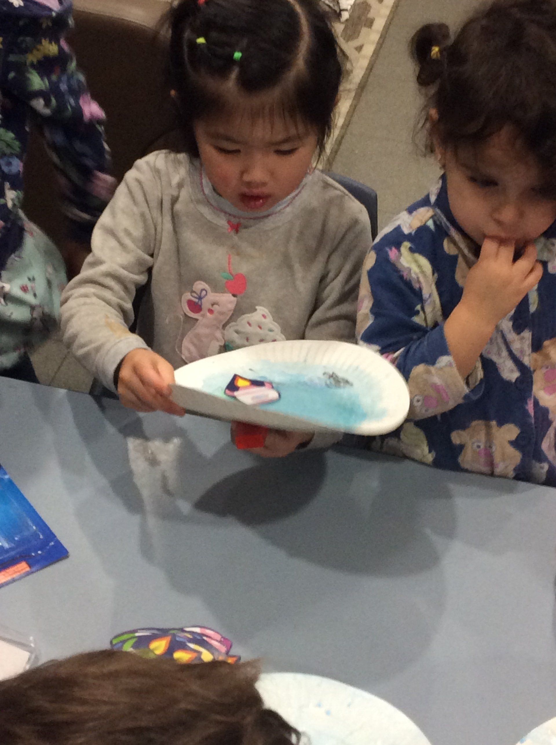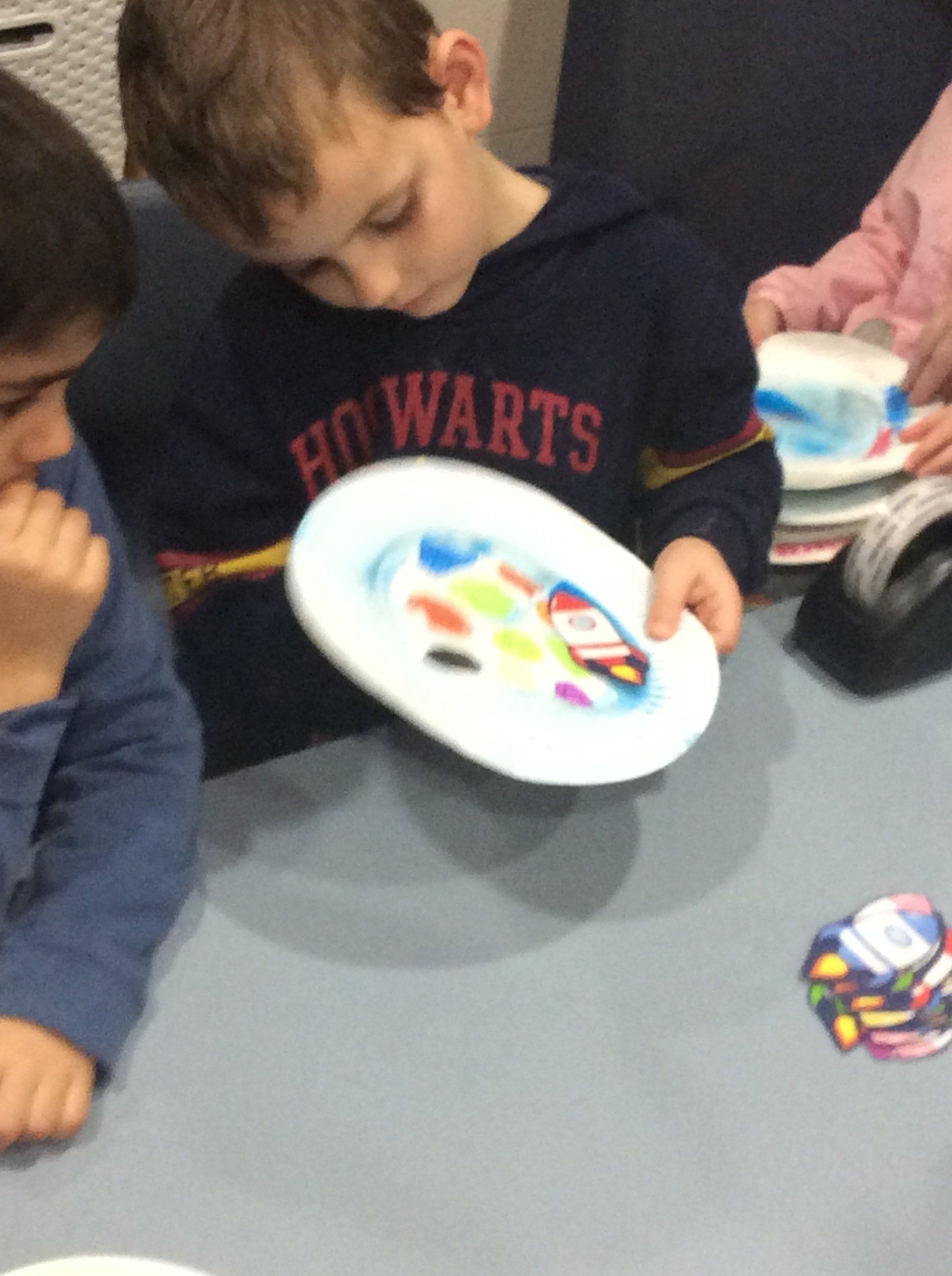 Once dry, we attached some paper clips to the back of a rocket picture and placed this on our Solar System plate and then using a magnet under the plate watched as the rocket moved about the Solar System.
